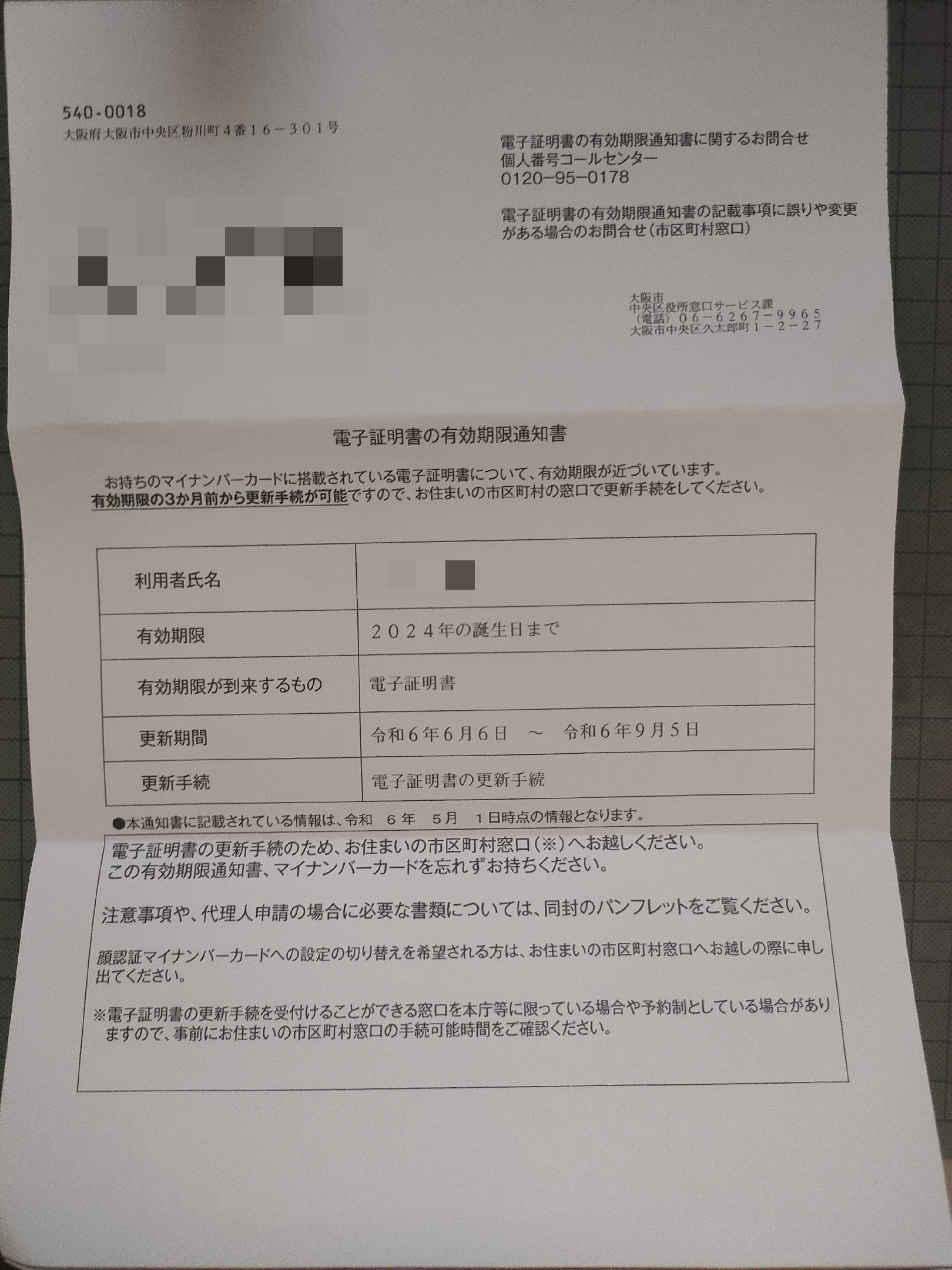 大阪市の区役所から「電子証明書の有効期限通知書」が届いた。